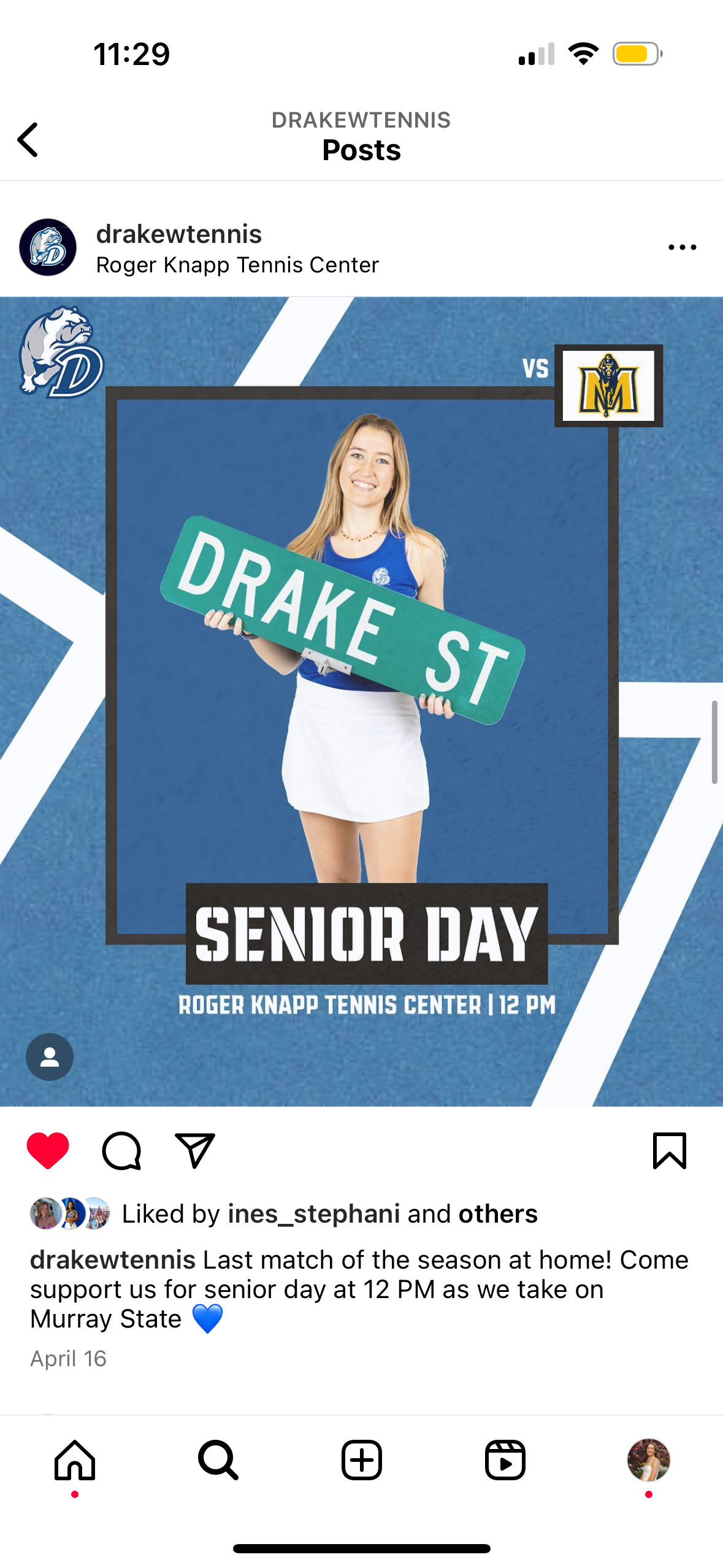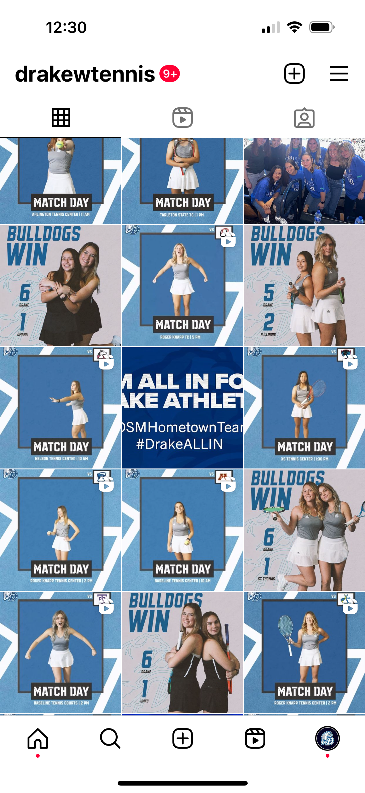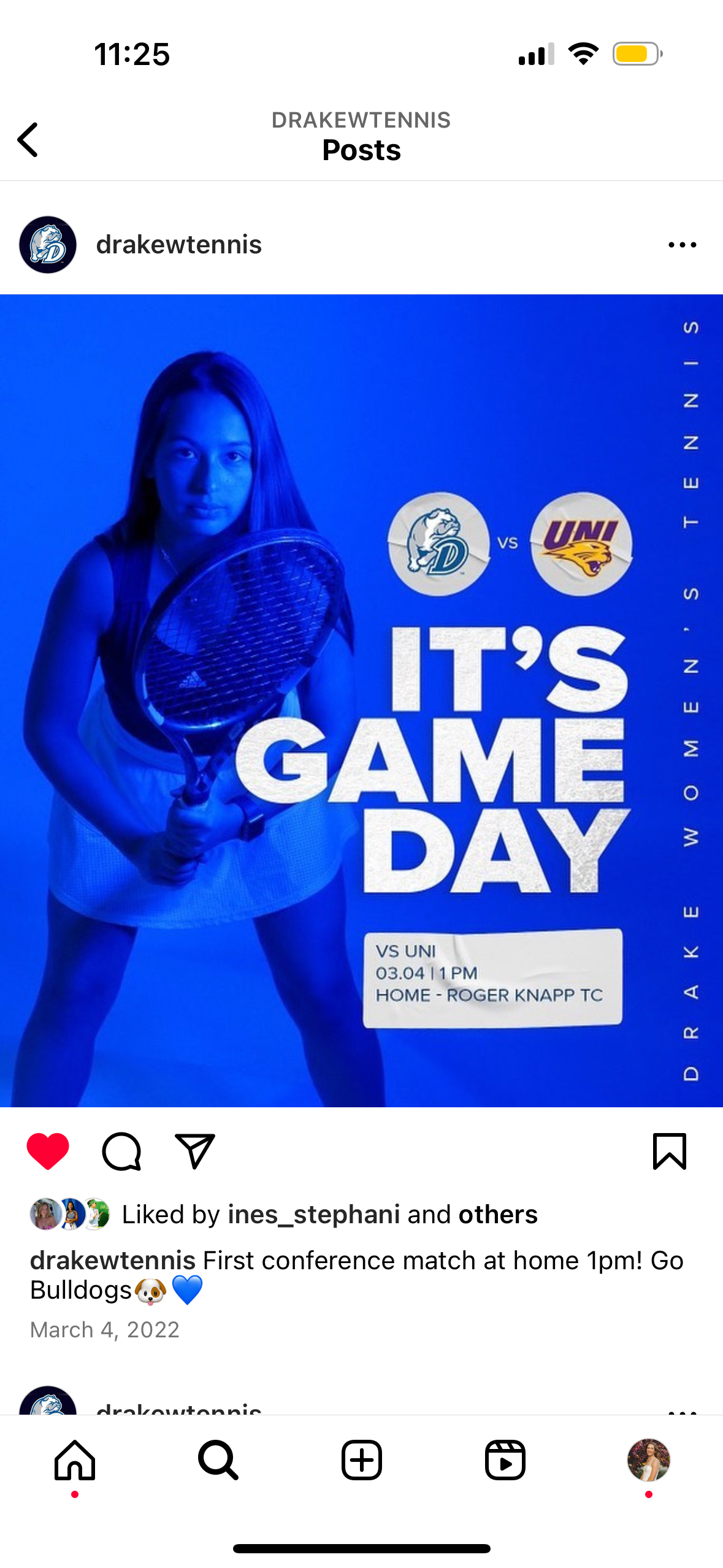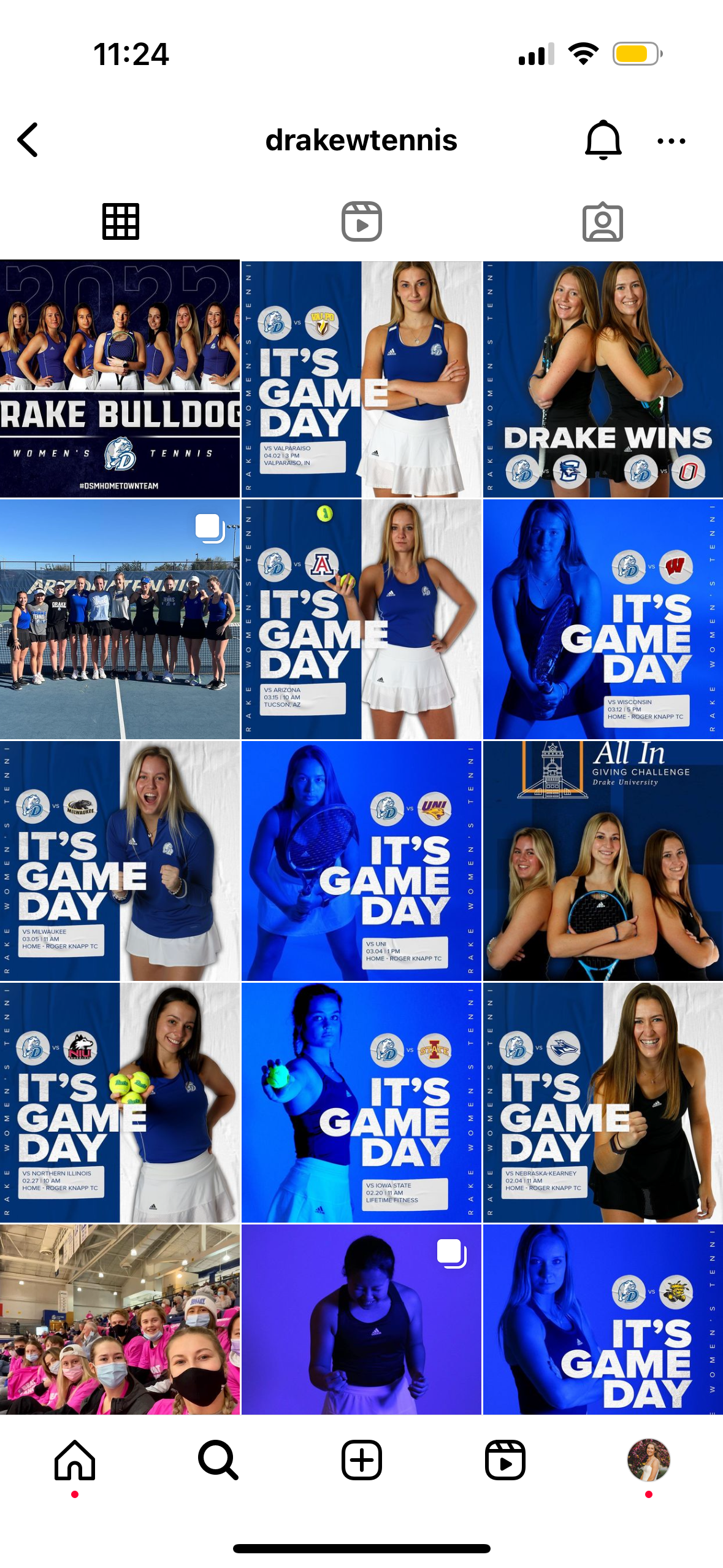 With my passion for sports and photography and as a member of Drake women's tennis, I took on a project to develop templates and social graphics for our team Instagram. The Instagram is self-led and I developed a more consistent branding system in line with Drake Athletics that is unique in comparison to other Division I tennis teams and builds excitement around the team.