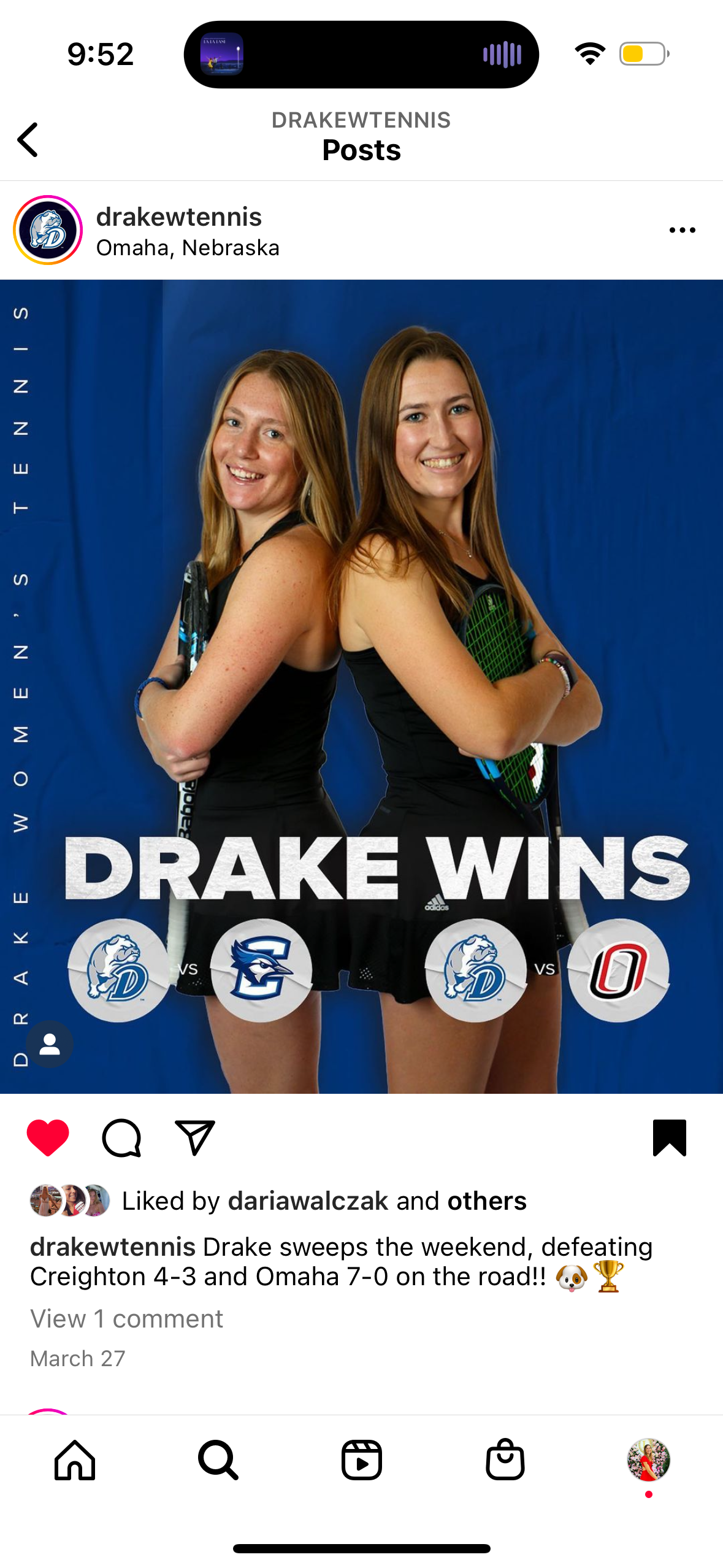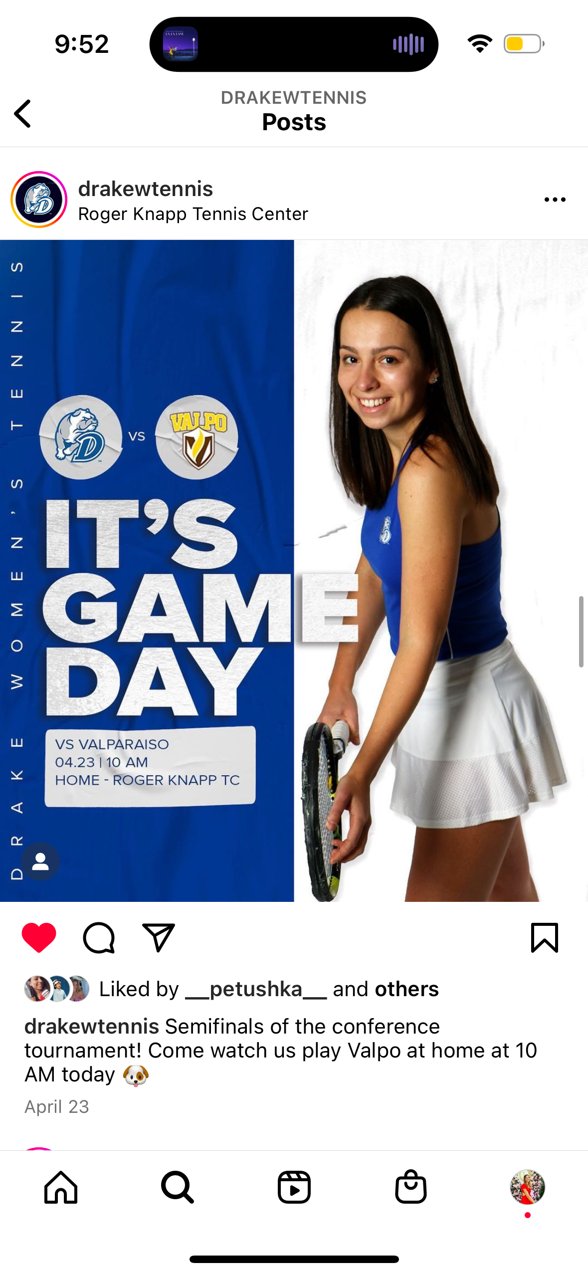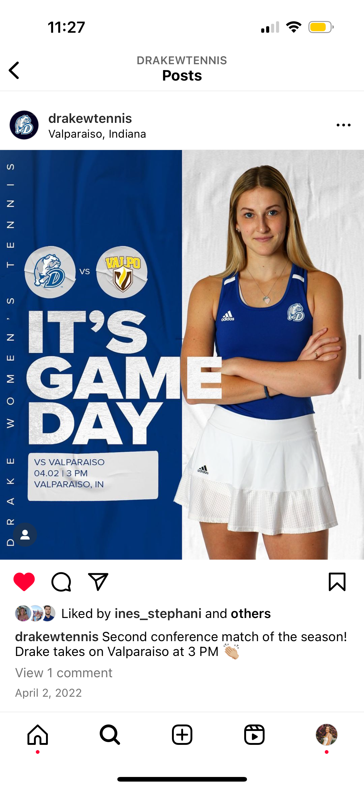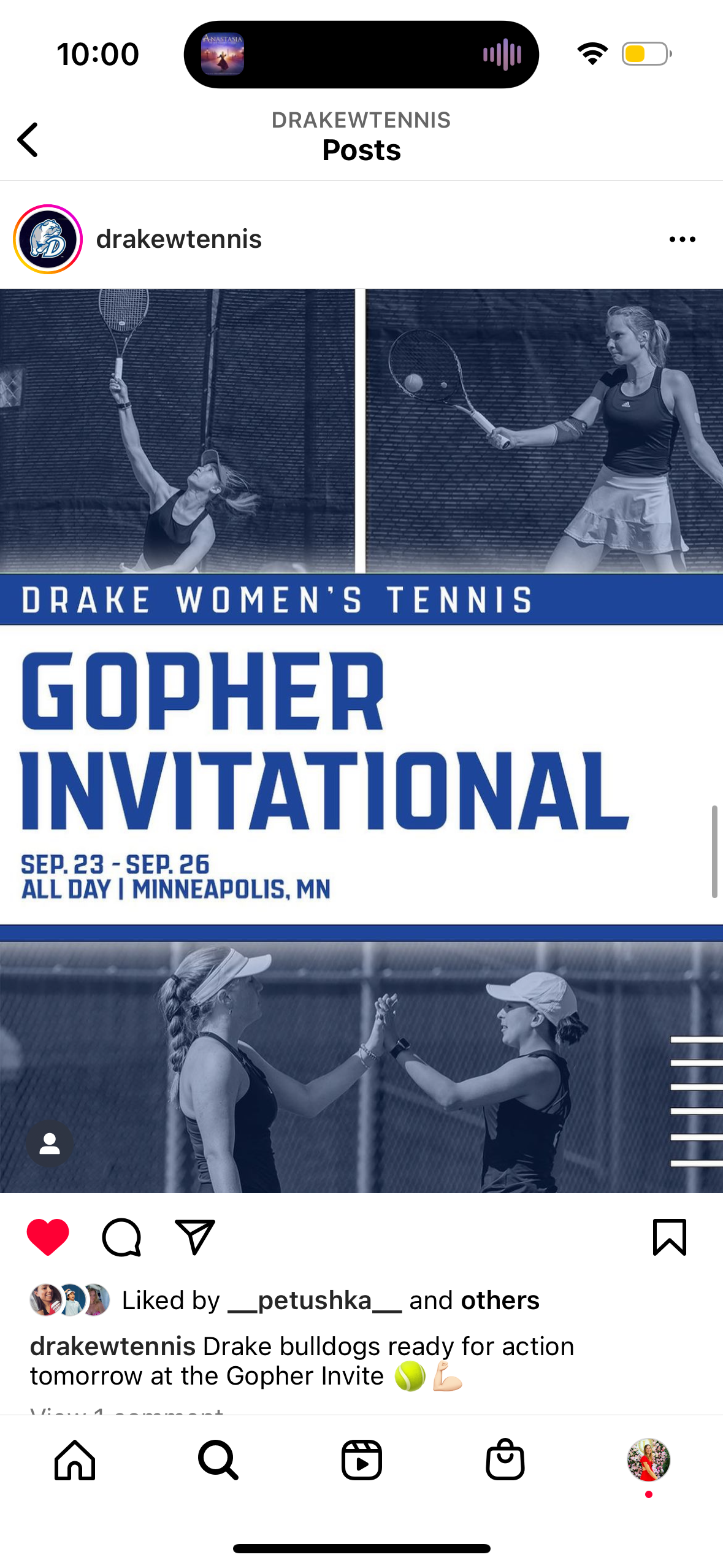With my passion for sports and photography and as a member of Drake women's tennis, I took on a project to develop templates and social graphics for our team Instagram. The Instagram is self-led and I developed a more consistent branding system in line with Drake Athletics that is unique in comparison to other Division I tennis teams and builds excitement around the team.