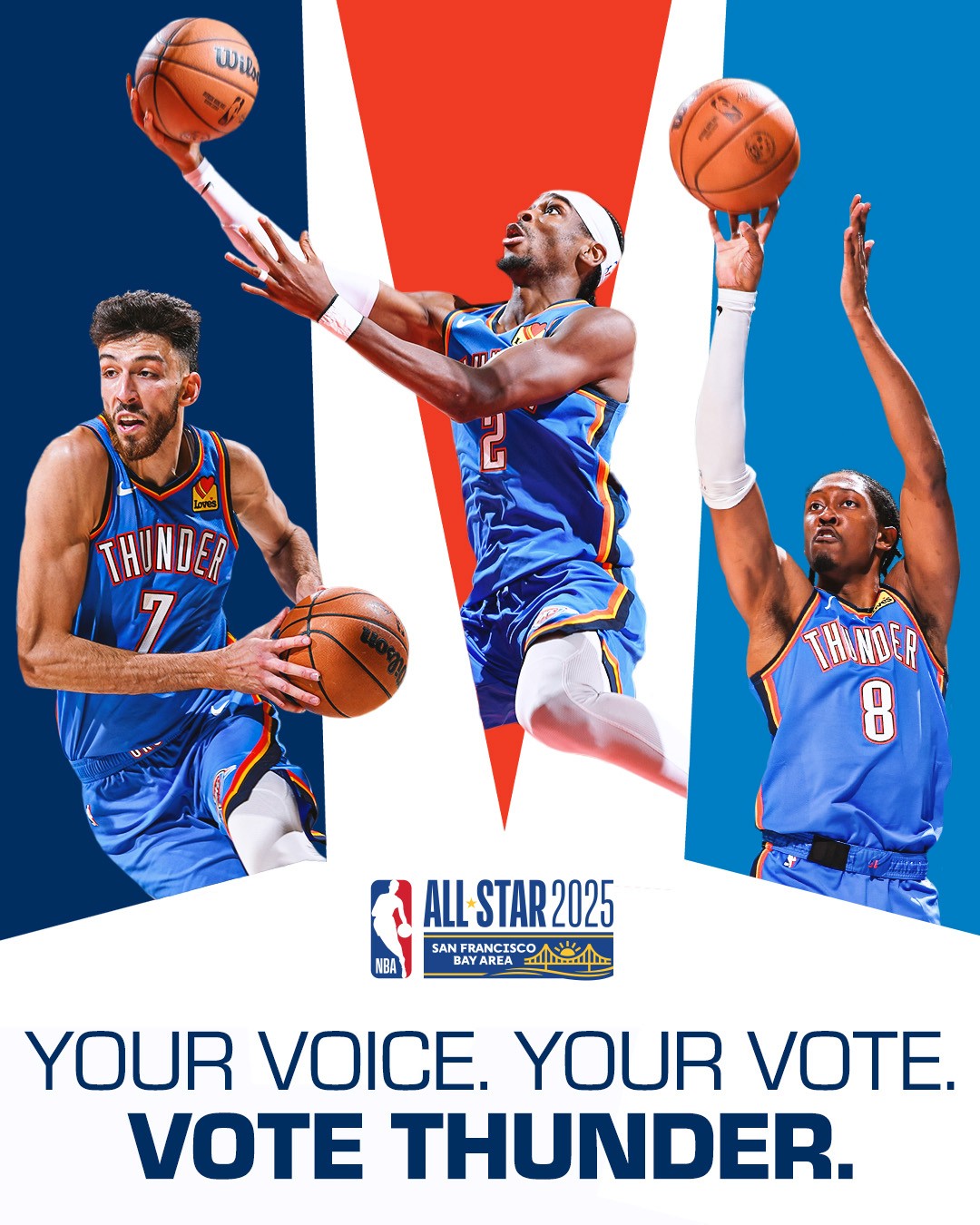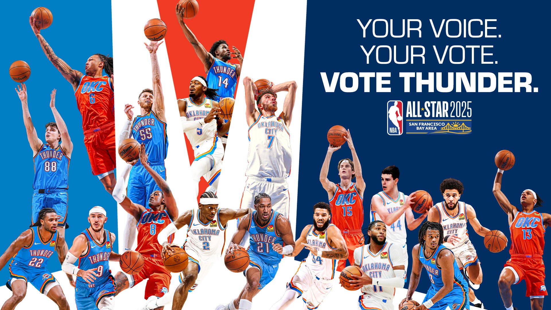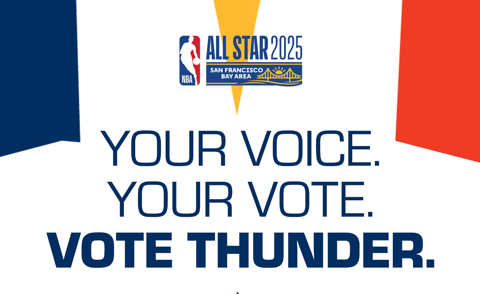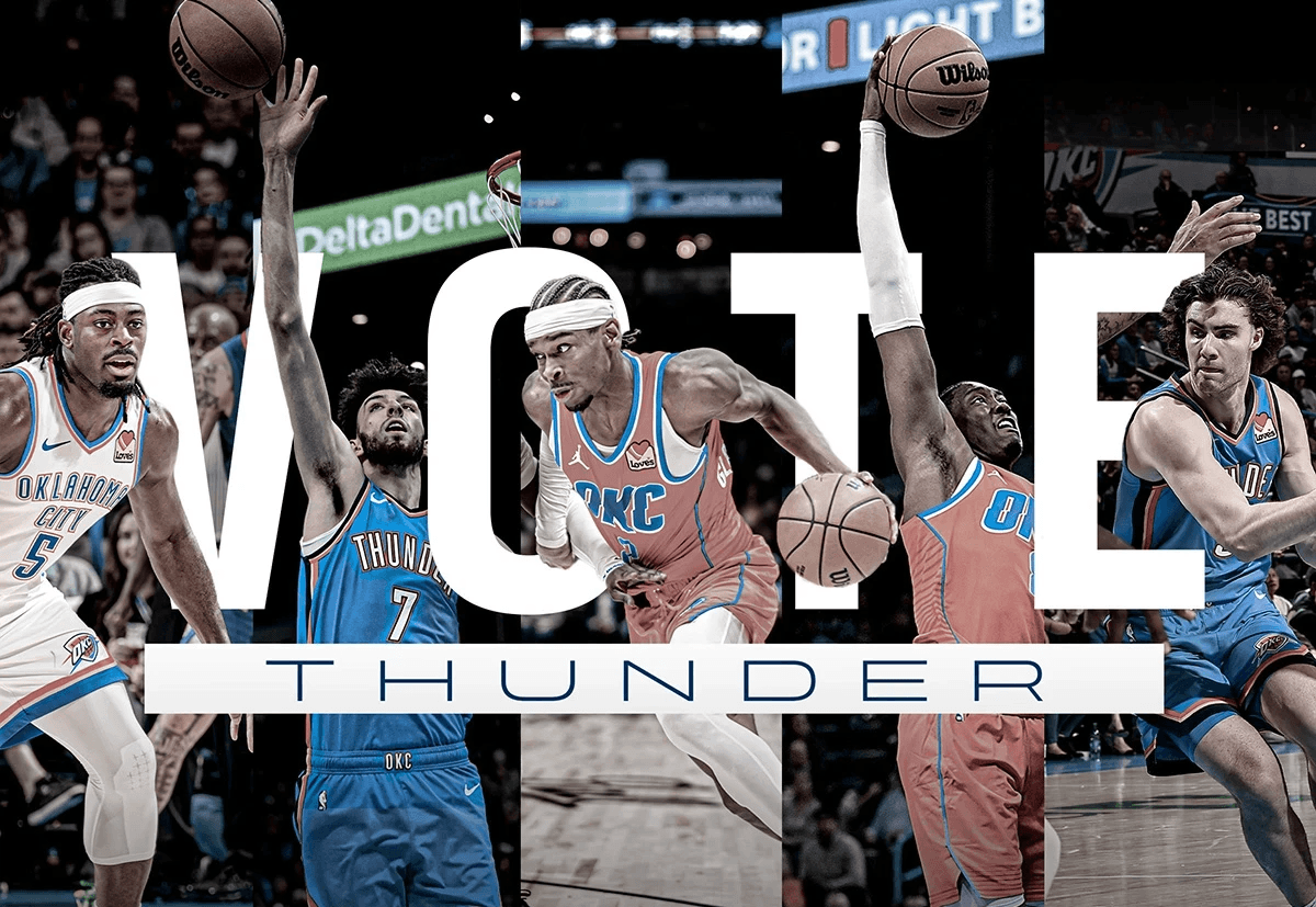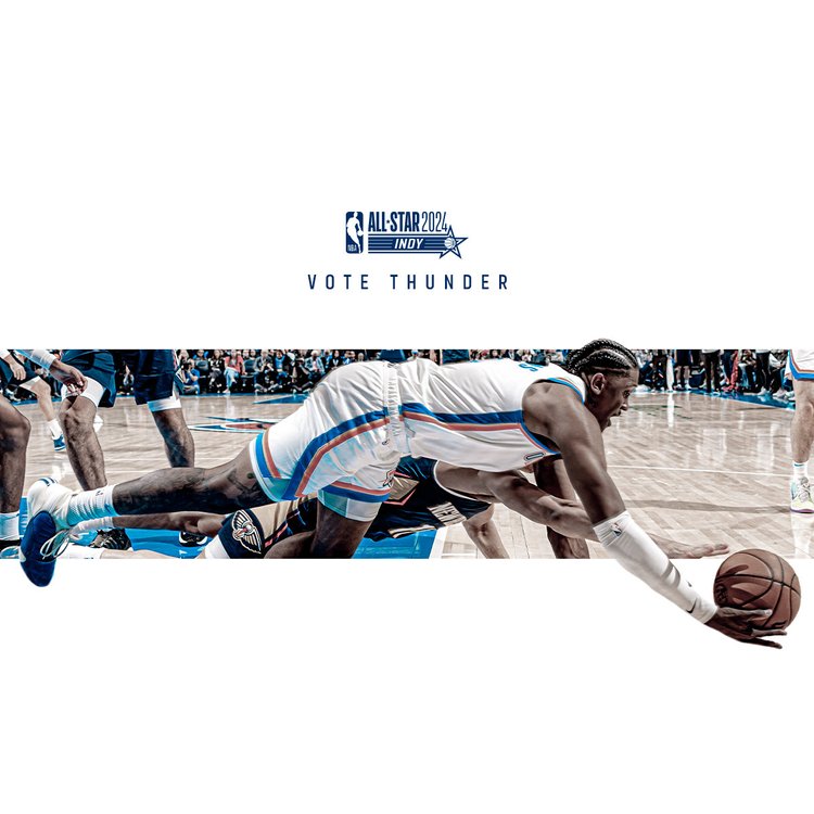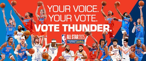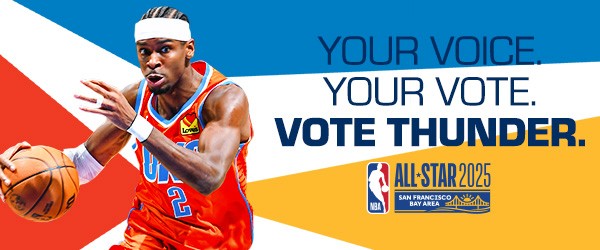 2025-26 - Thunder players represent the intersection of the team and our community, which manifests in a duty to vote among our fan base. This is where shape, typographic form, and photo/video come together with the player at the center. These points always frame the player(s) to draw emphasis and reinforce the idea that they are representative of our community and team. Photography always displays the players in action, showing that they play for us night after night prompting fans to show gratitude for their continuous effort with their vote.