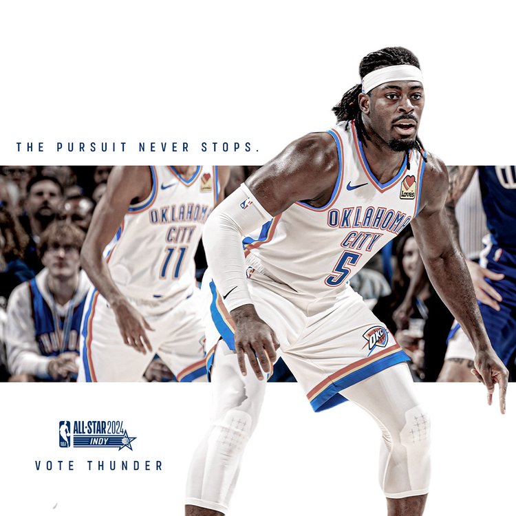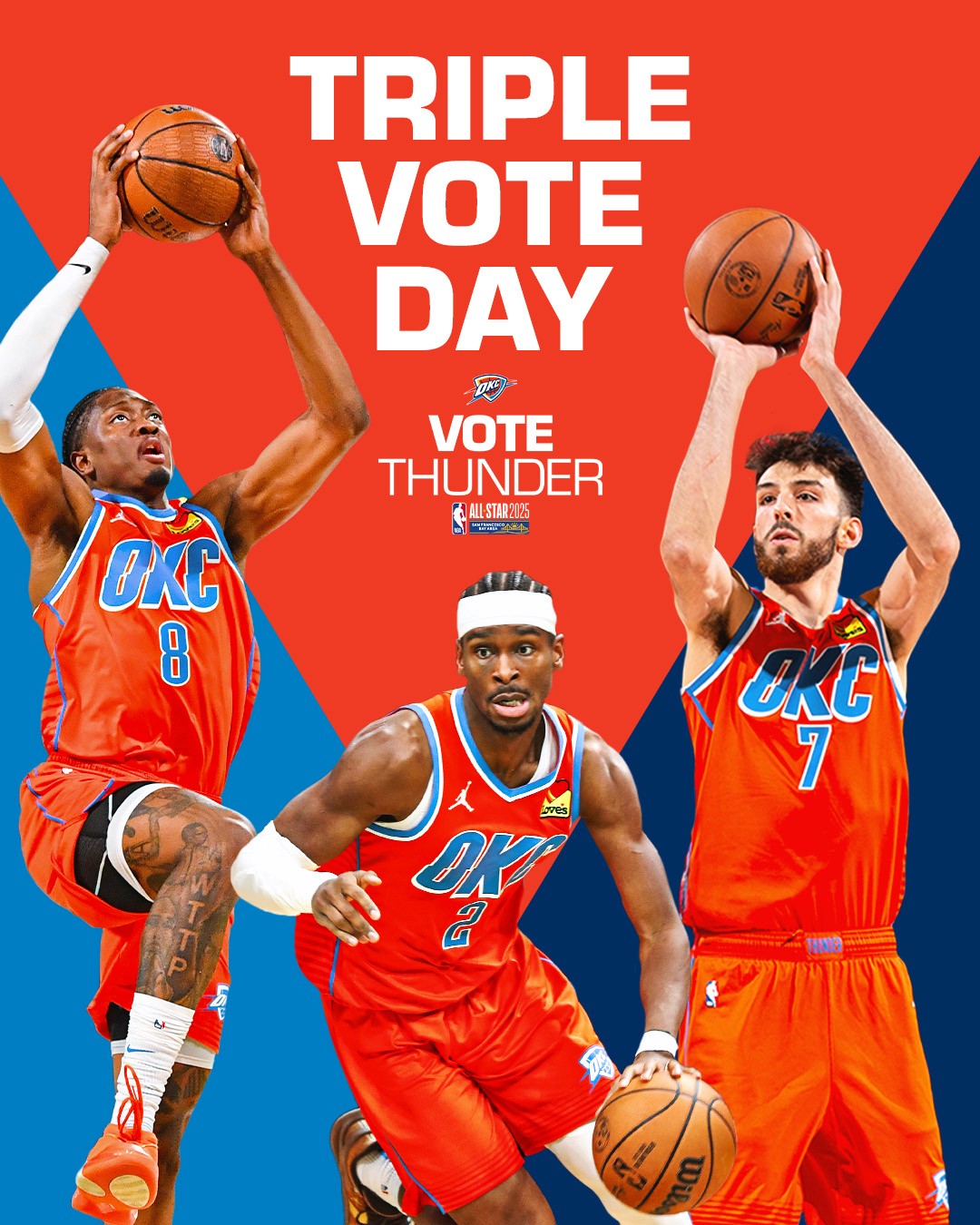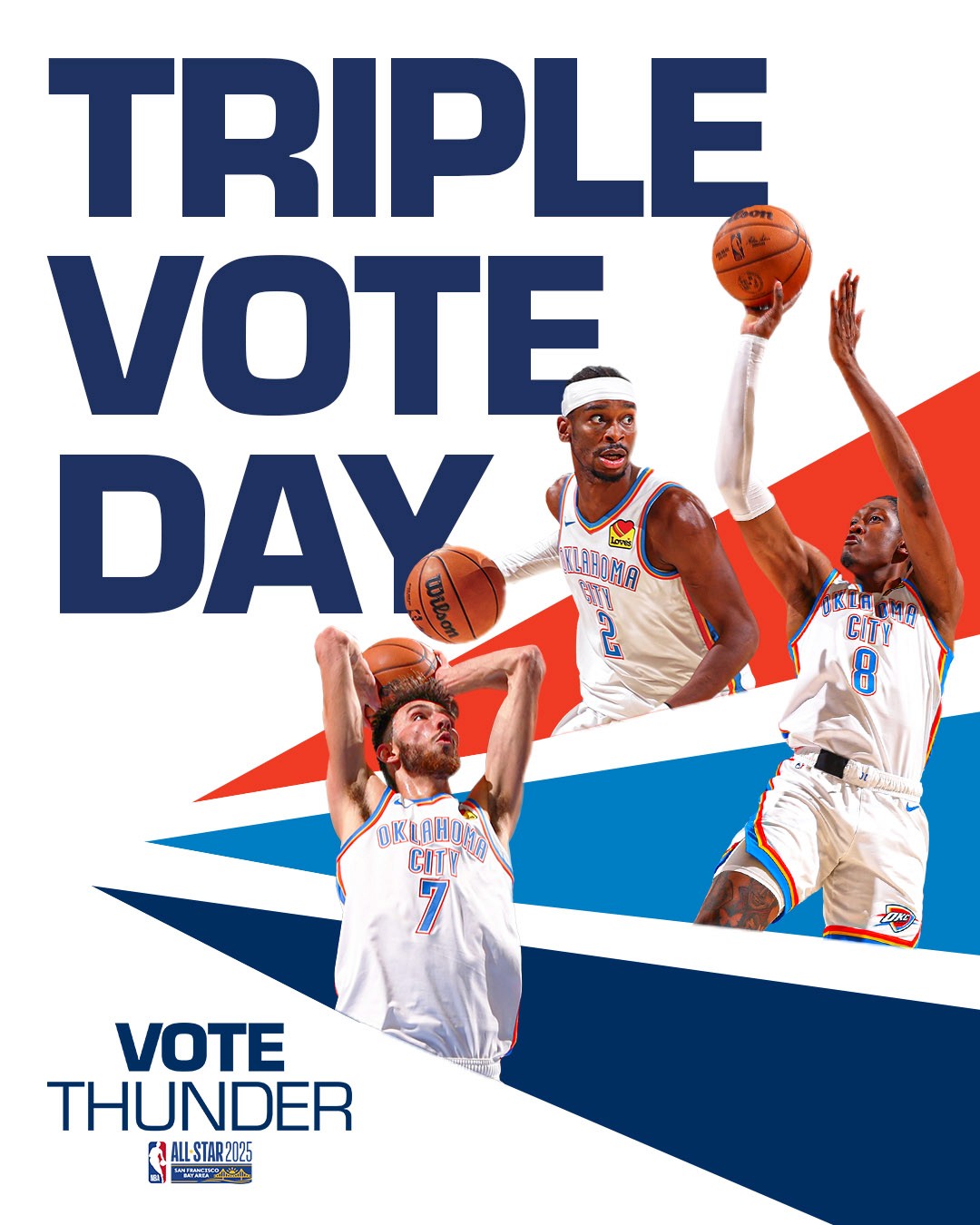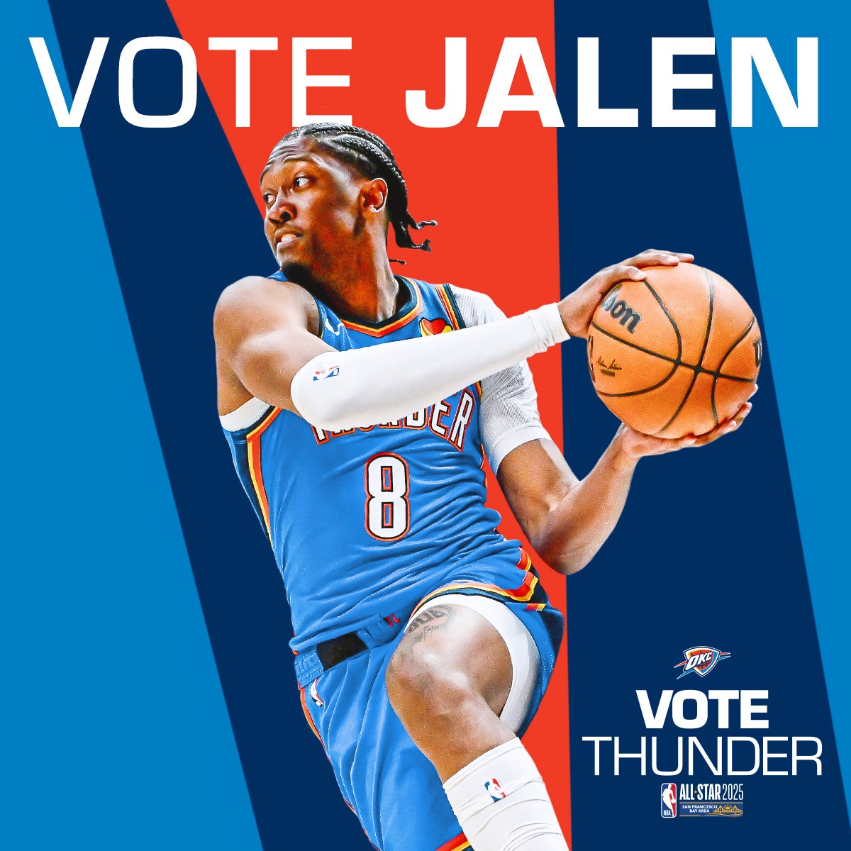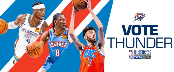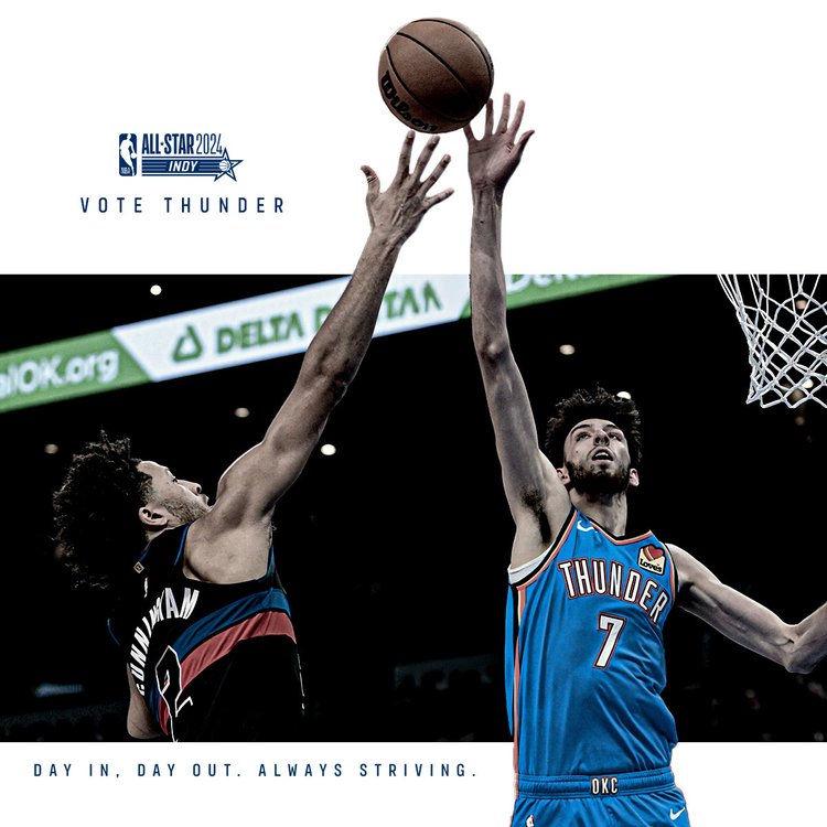 2025-26 - Thunder players represent the intersection of the team and our community, which manifests in a duty to vote among our fan base. This is where shape, typographic form, and photo/video come together with the player at the center. These points always frame the player(s) to draw emphasis and reinforce the idea that they are representative of our community and team. Photography always displays the players in action, showing that they play for us night after night prompting fans to show gratitude for their continuous effort with their vote.