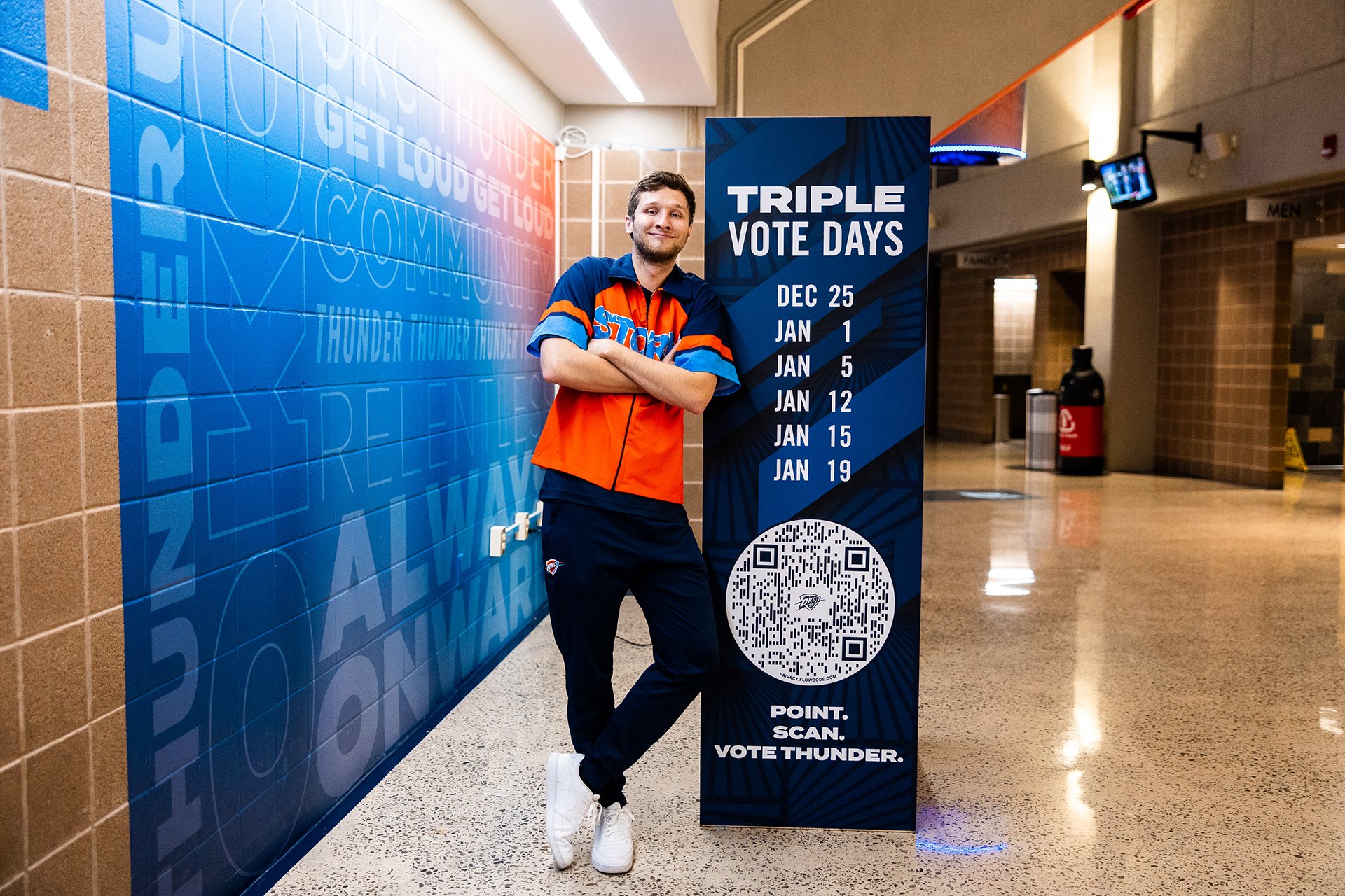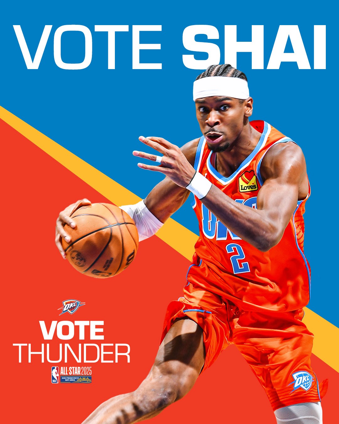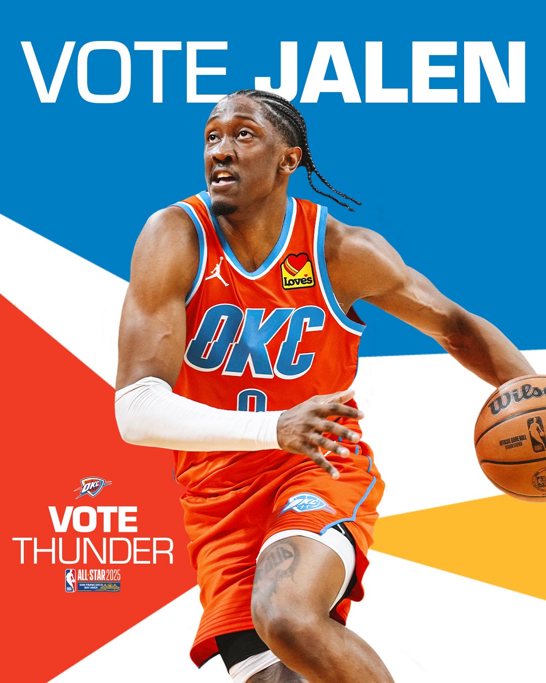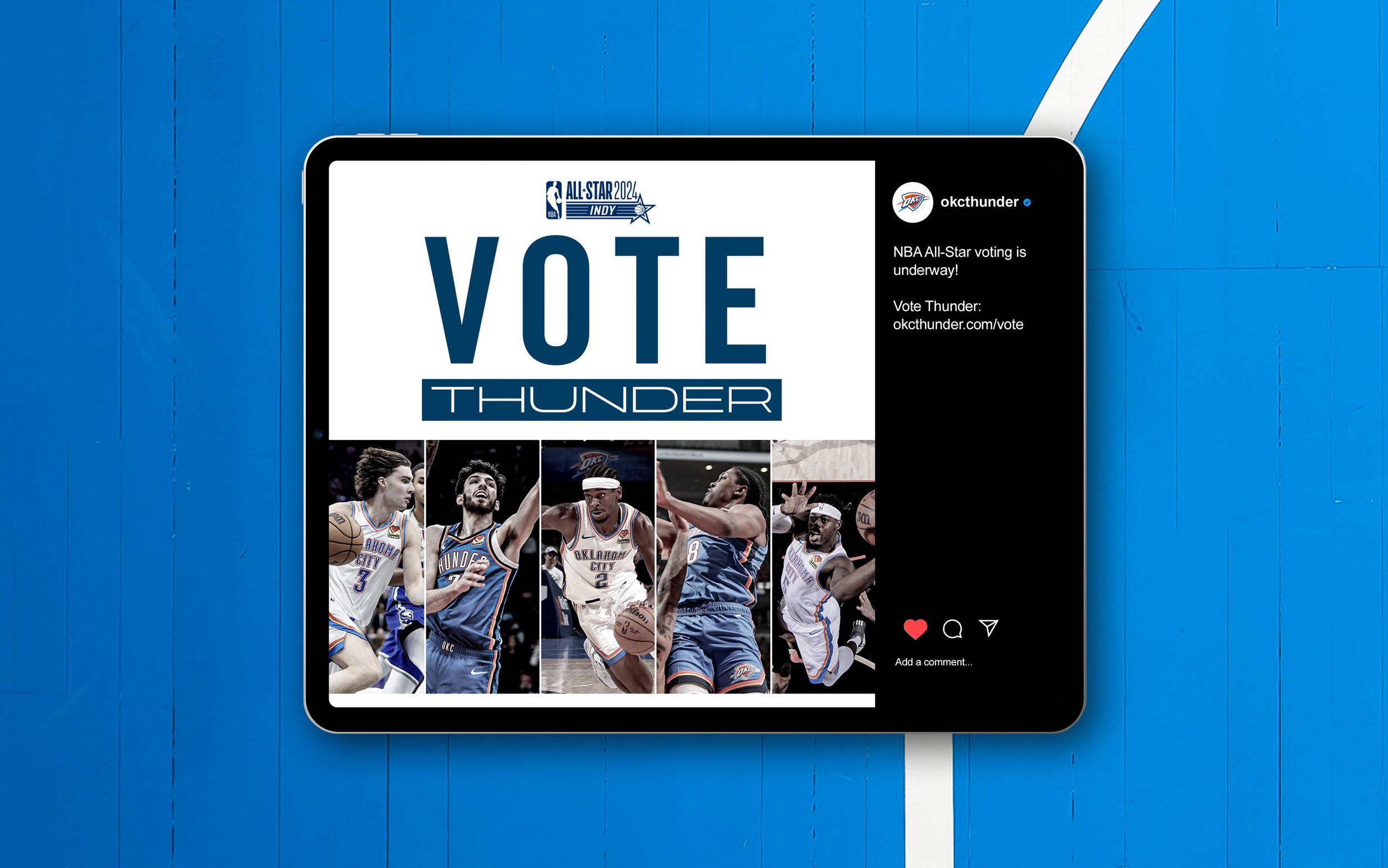 2025-26 - Thunder players represent the intersection of the team and our community, which manifests in a duty to vote among our fan base. This is where shape, typographic form, and photo/video come together with the player at the center. These points always frame the player(s) to draw emphasis and reinforce the idea that they are representative of our community and team. Photography always displays the players in action, showing that they play for us night after night prompting fans to show gratitude for their continuous effort with their vote.