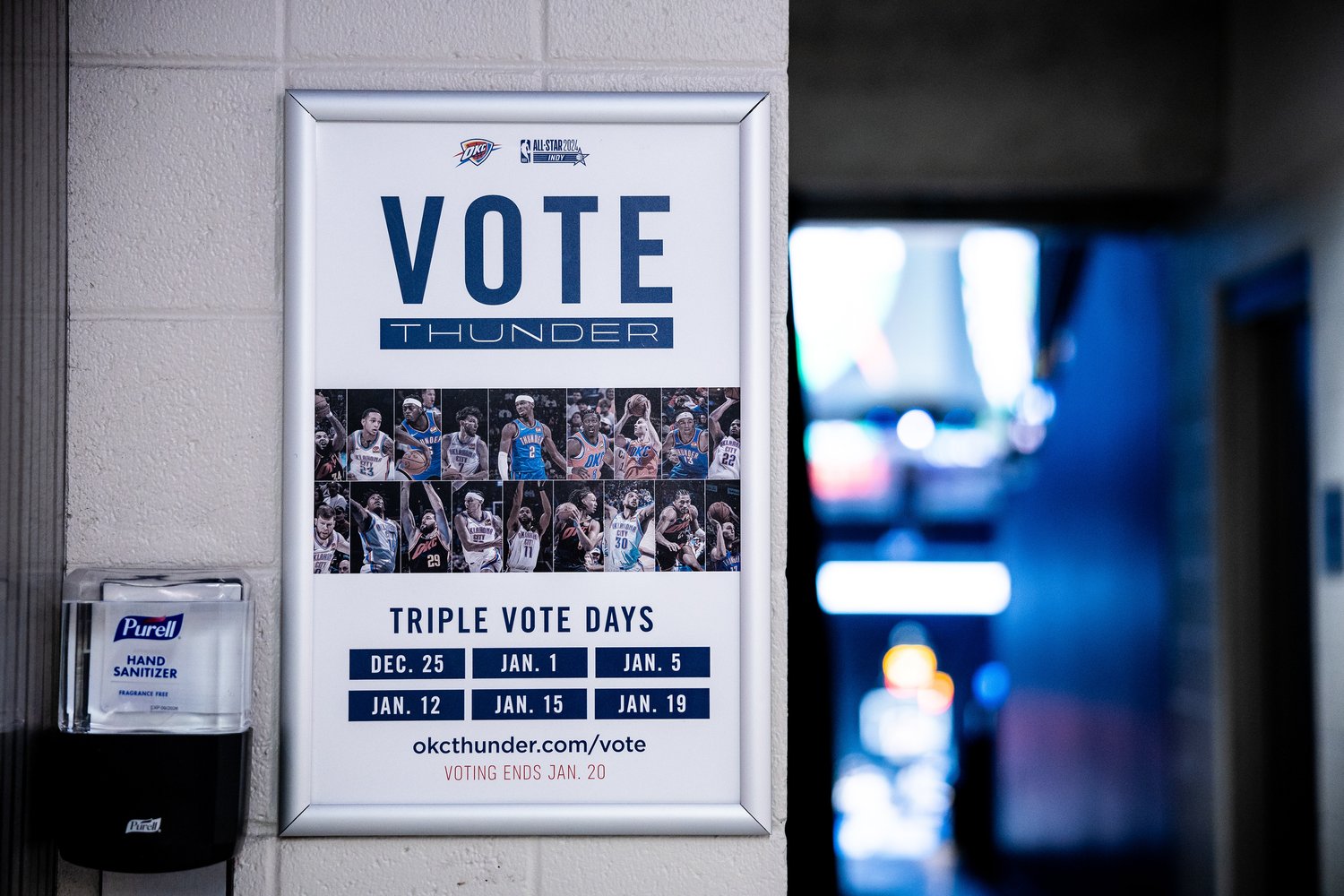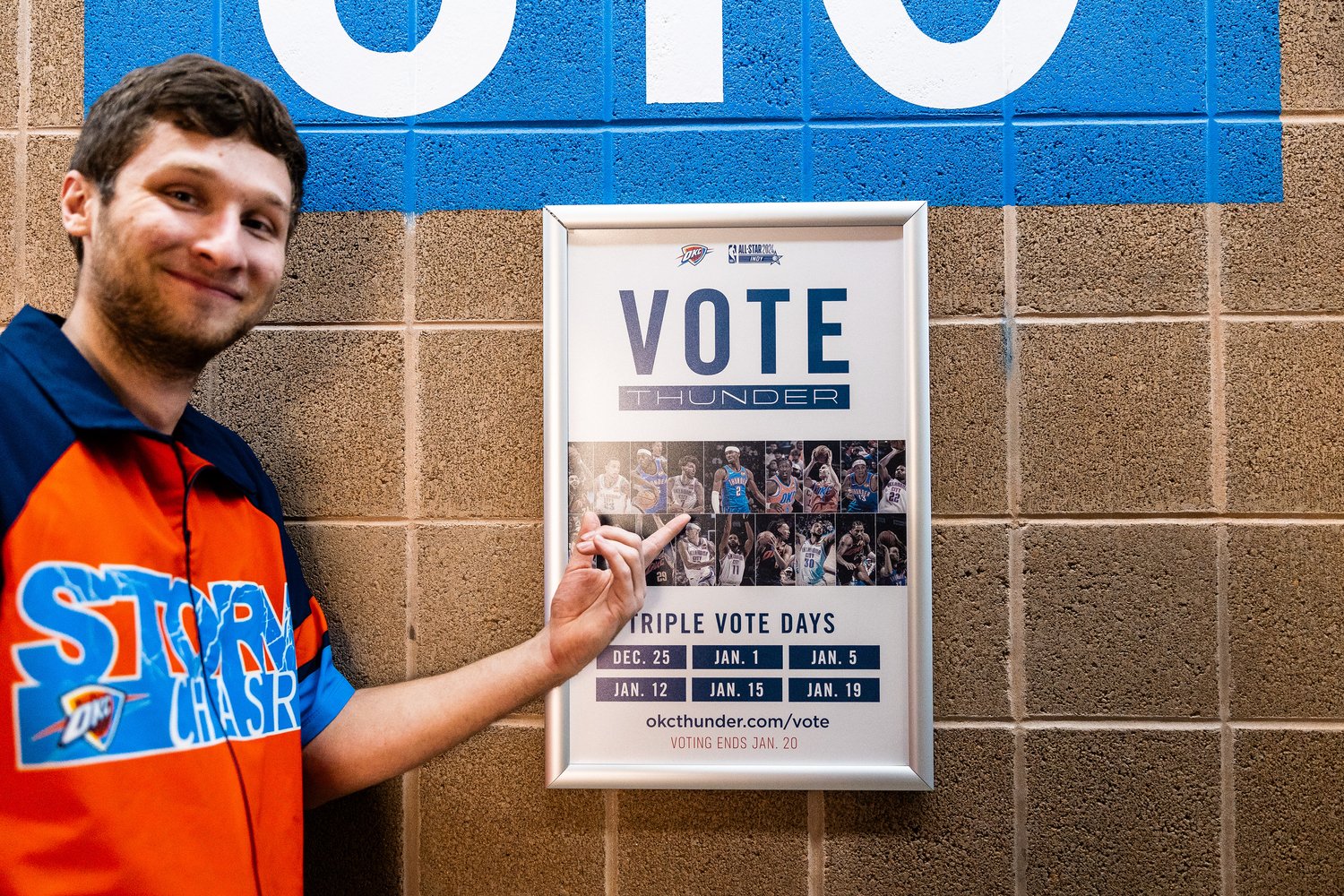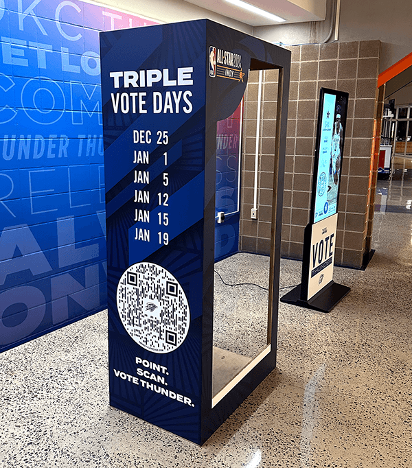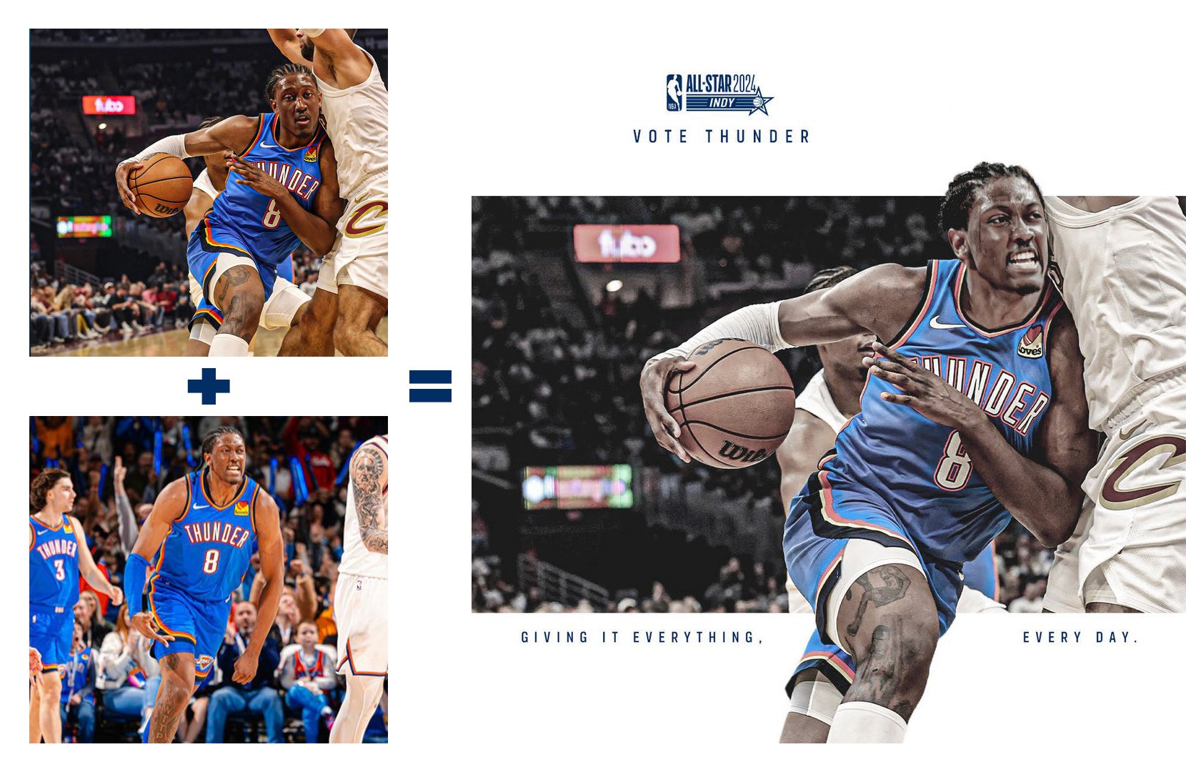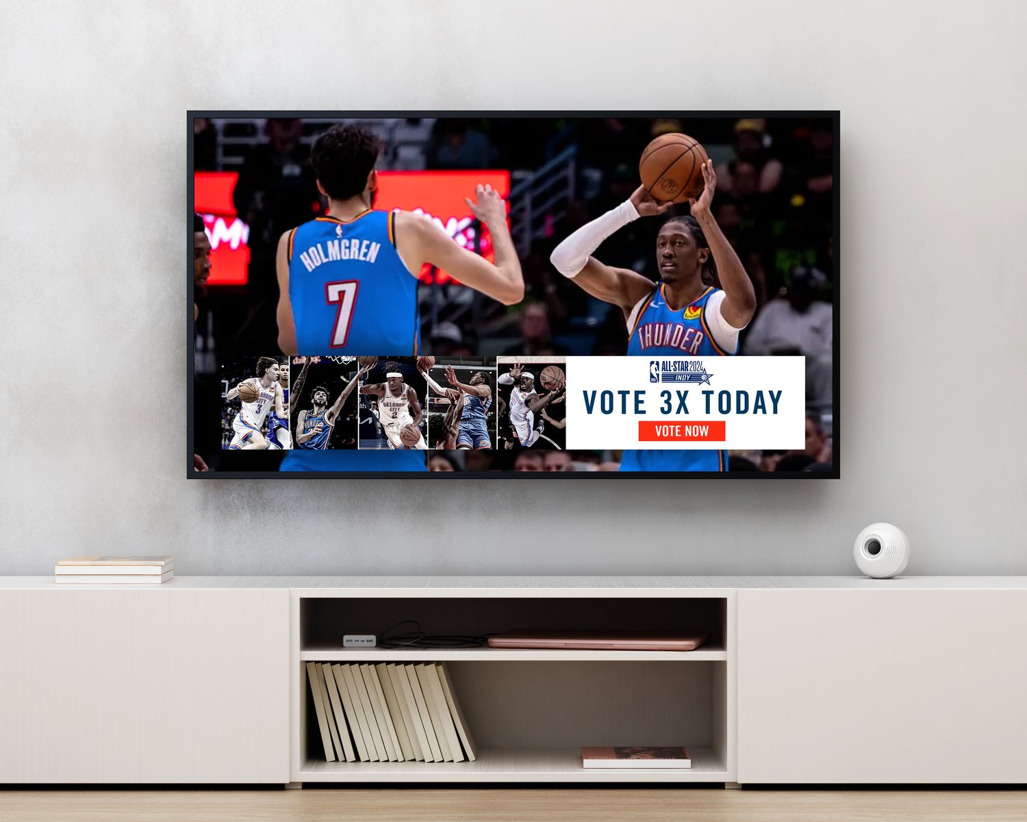 2025-26 - Thunder players represent the intersection of the team and our community, which manifests in a duty to vote among our fan base. This is where shape, typographic form, and photo/video come together with the player at the center. These points always frame the player(s) to draw emphasis and reinforce the idea that they are representative of our community and team. Photography always displays the players in action, showing that they play for us night after night prompting fans to show gratitude for their continuous effort with their vote.